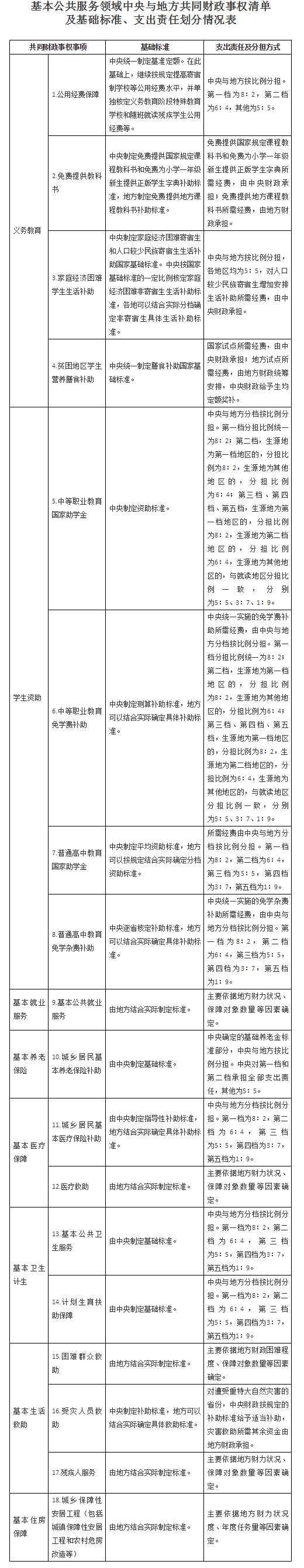 附:基本公共服務領域中央與地方共同財政事權清單及基礎標準、支出責任劃分情況表。來自中國政府網(wǎng)