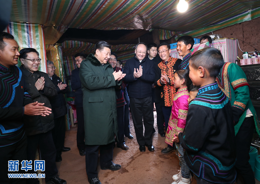 這是2月11日上午,習近平在涼山彝族自治州昭覺縣三岔河鄉(xiāng)三河村貧困戶吉好也求家中看望,聽10歲小女孩吉好有果唱《國旗國旗真美麗》。新華社記者 鞠鵬 攝