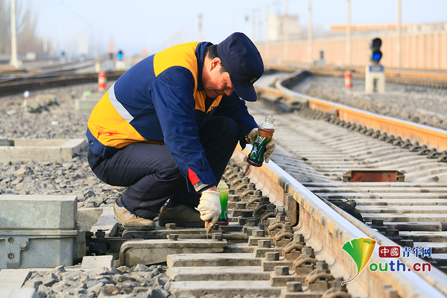 農(nóng)歷正月初八這天,邰芳鵬和工區(qū)3名年輕職工一同到現(xiàn)場,對阿克蘇站信號機和道岔進行巡視檢查。中國青年網(wǎng)通訊員 姚旭東 攝