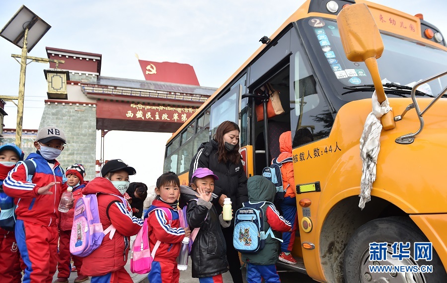 3月27日,克松村的孩子們登上校車出發(fā)去幼兒園。 新華社記者覺(jué)果攝