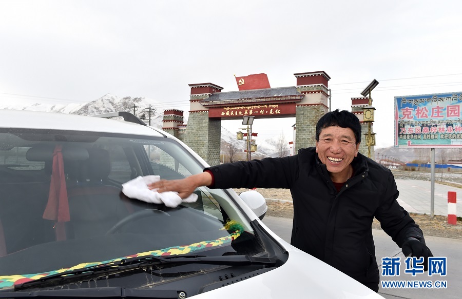 3月27日,克松村致富能手達(dá)瓦準(zhǔn)備開(kāi)車出行。 新華社記者覺(jué)果攝