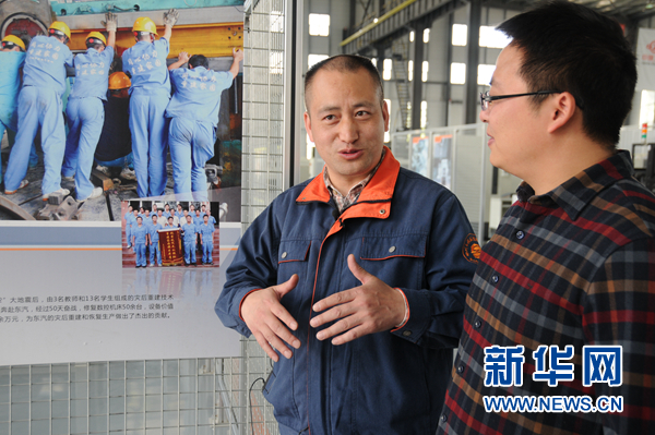 胡明華(左)與團隊成員一起向記者回憶2008年他們援助東汽災(zāi)后重建工作的情形。新華網(wǎng) 聶晨靜 攝