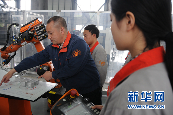 胡明華在機器人應(yīng)用工程實驗室里指導(dǎo)學(xué)生們進行機器人操作學(xué)習(xí)。新華網(wǎng) 聶晨靜 攝