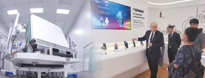 圖左為維信諾(固安)第六代全柔AMOLED生產(chǎn)線智能車間,圖右為維信諾總裁張德強博士(左一)介紹柔性屏產(chǎn)品終端應(yīng)用。資料圖片 制圖:張丹峰
