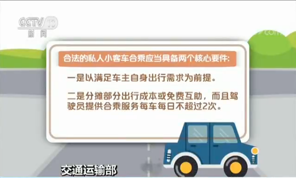 交通運輸部表示,合法的私人小客車合乘應當具備兩個核心要件:一是以滿足車主自身出行需求為前提,二是分攤部分出行成本或免費互助,而且駕駛員提供合乘服務每車每日不超過2次。
