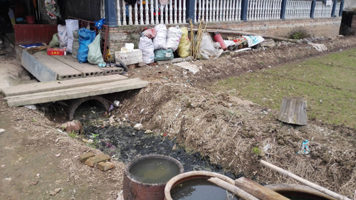 一個主打“土雞土菜”的農家樂,餐廚廢水直接排到屋后的水渠,長年累月形成了黑色油膩的泥垢。記者 白田田 攝