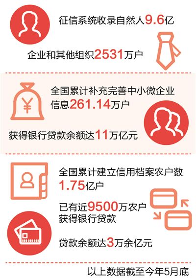 目前中國人民銀行的征信系統(tǒng)已建設(shè)成為國內(nèi)規(guī)模最大、收集信用信息最全、覆蓋范圍和使用最廣的信用信息基礎(chǔ)數(shù)據(jù)庫。數(shù)據(jù)顯示,截至今年5月底,征信系統(tǒng)收錄自然人9.6億,企業(yè)和其他組織2531萬戶。