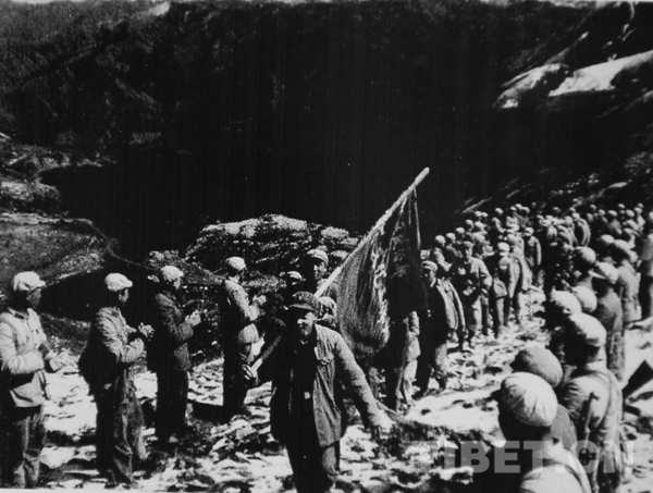圖片為西藏文工團老照片:第三文化工作隊向乃堆拉的山口前進,王勉之是旗手。 圖片由王勉之提供