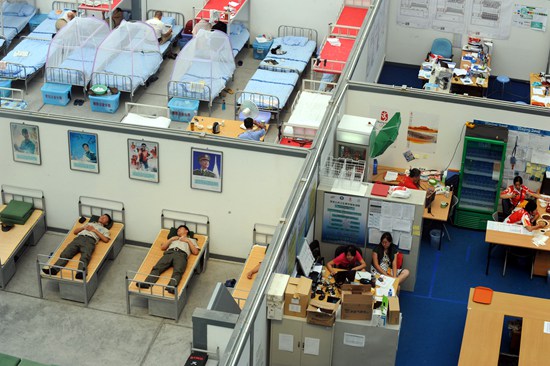 2008年8月17日,北京水立方游泳館,志愿者餐飲休息區(qū)。視覺中國供圖