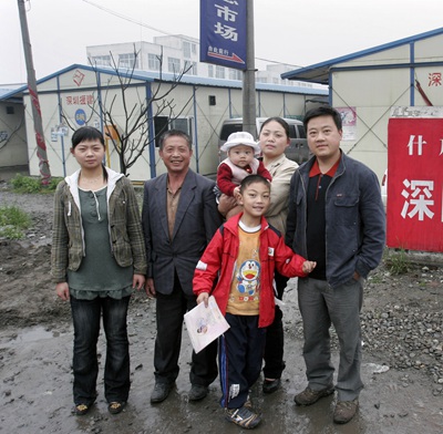 2009年5月8日,四川省什邡市,在地震中受災的徐興蓉全家在自家板房小區(qū)門口。2008年8月8日,徐興蓉在什邡產下“奧運寶寶”。張曉理/攝