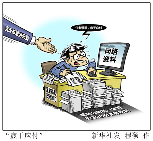 湖北省某縣委政研室干部說,一些黨員干部特別是領(lǐng)導(dǎo)干部能力不濟,把發(fā)文、開會當作抓落實的主要方式方法,甚至將其做成履職盡責、推卸責任的“痕跡”,一些文件層層轉(zhuǎn)發(fā)、照抄照轉(zhuǎn),很多時候并無新的實質(zhì)性內(nèi)容,完全是重復(fù)上級精神,造成基層干部有看不完的文件、開不完的會。