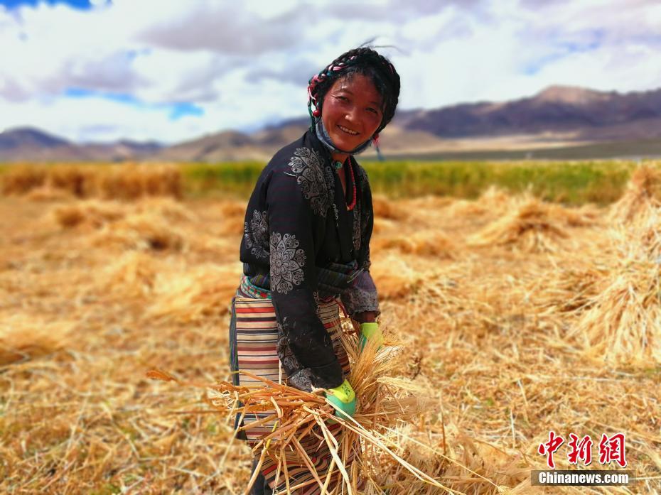 圖為9月12日日喀則市定日縣扎果鄉(xiāng)的農(nóng)牧民次仁曲珍在地里收青稞。 中新社記者 趙延 攝