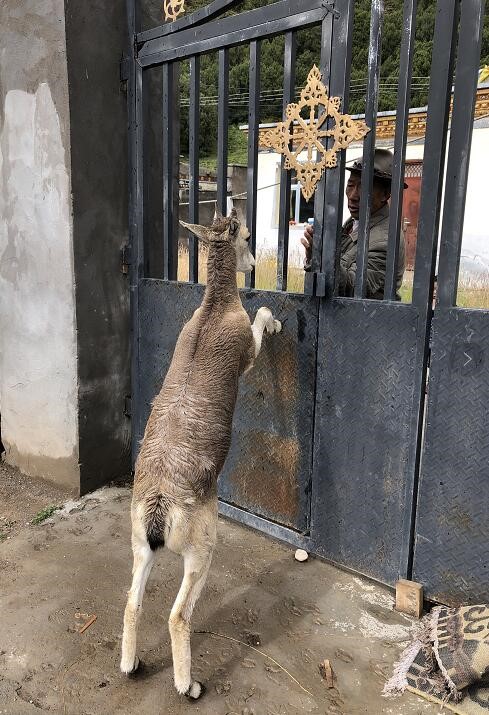 68歲的雜多縣昂賽鄉(xiāng)老獸醫(yī)求軍結(jié)束了一天的工作,背著沉重的藥箱回到家中,關(guān)上庭院大門的一刻,一只可愛的小巖羊突然躥了出來,趴在大門上撒著嬌,不愿離去。