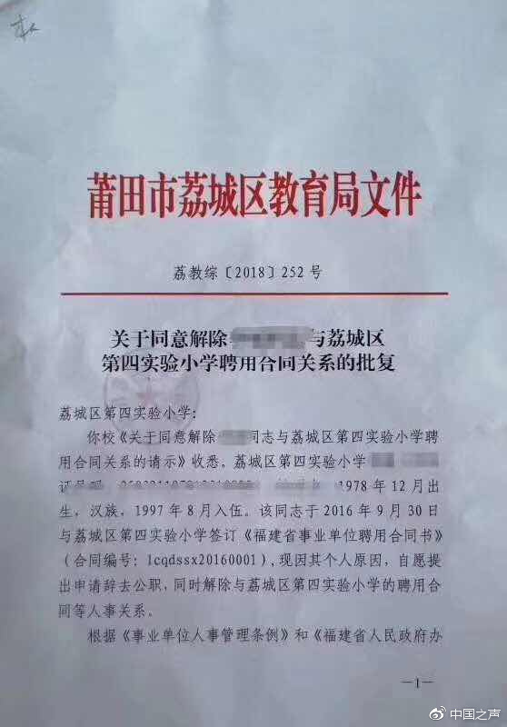 網(wǎng)上還流傳著一份落款為荔城區(qū)教育局9月19日的紅頭文件,該文件是發(fā)給荔城區(qū)第四實驗小學的,主要內(nèi)容是因老師個人原因,自愿提出申請辭去公職,教育局批復同意解除這名教師和學校的人事關(guān)系。有家長因此將此文件和微信截圖聯(lián)系在一起,在朋友圈表示,微信截圖中的“廖老師”已經(jīng)被解職。