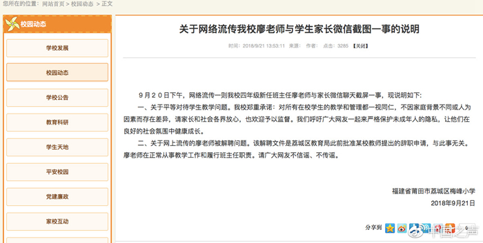 下午,涉事的莆田市荔城區(qū)梅峰小學在其官方網(wǎng)站發(fā)布消息,該解聘文件是荔城區(qū)教育局此前批準某校教師提出的辭職申請,與此事無關(guān)。廖老師在正常從事教學工作和履行班主任職責。