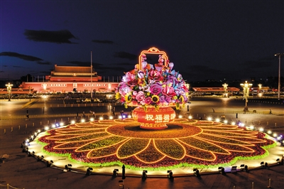 9月23日凌晨,天安門廣場高達17米的“祝福祖國”巨型花籃完工,正式與游客見面。除了天安門廣場,長安街沿線建國門至復興門的10處花壇,也為節(jié)日的北京增添喜慶。