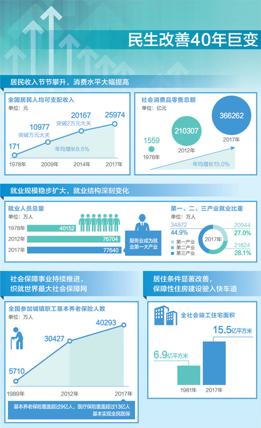 改革開放40年,是我國經(jīng)濟(jì)飛速發(fā)展、經(jīng)濟(jì)總量連上新臺階的40年,也是全體人民共享改革發(fā)展成果、生活水平大幅提高的40年。黨的十八大以來,以習(xí)近平同志為核心的黨中央堅(jiān)持以人民為中心的發(fā)展思想,統(tǒng)籌做好就業(yè)、收入分配、社會保障、醫(yī)療衛(wèi)生等各領(lǐng)域民生工作,城鄉(xiāng)居民生活向全面小康社會更加扎實(shí)地邁進(jìn)。人民群眾的獲得感、幸福感、安全感更充實(shí)、更有保障、更可持續(xù)。