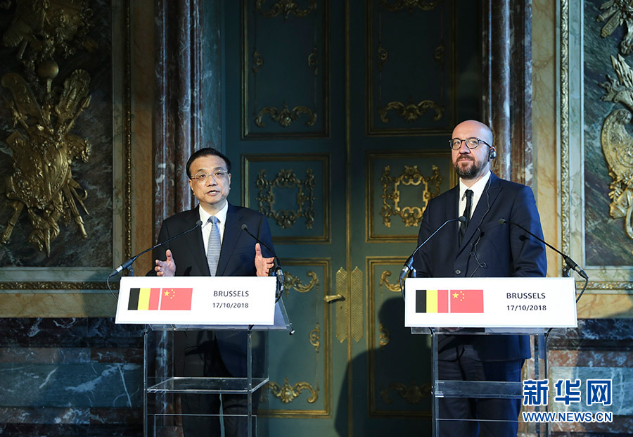 當(dāng)?shù)貢r(shí)間10月17日上午,國(guó)務(wù)院總理李克強(qiáng)在布魯塞爾埃格蒙宮與比利時(shí)首相米歇爾共同會(huì)見(jiàn)記者。 新華社記者 丁海濤 攝