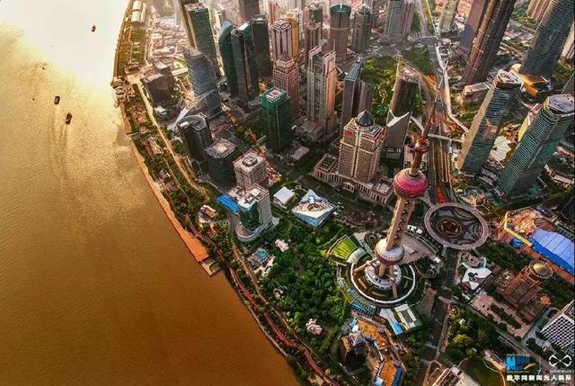 ↑無(wú)人機(jī)航拍上海沿江美景,江水被鍍上一層金黃。新華網(wǎng)發(fā) 王正坤 攝