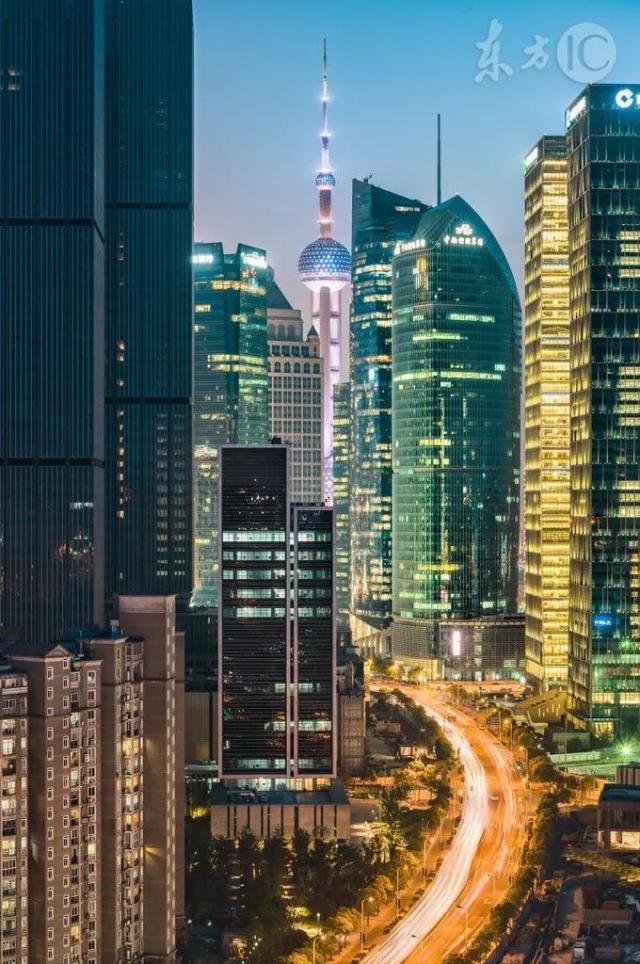 燈光璀璨,車(chē)燈組成的車(chē)流駛向東方明珠。