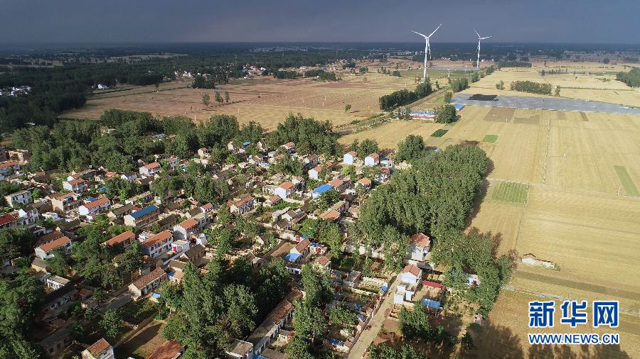 這是6月20日無(wú)人機(jī)拍攝的河南蘭考縣東壩頭鄉(xiāng)張莊村周圍的麥田和風(fēng)機(jī)。 新華社記者 馮大鵬 攝
