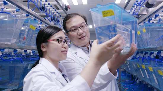 科研人員觀察斑馬魚。