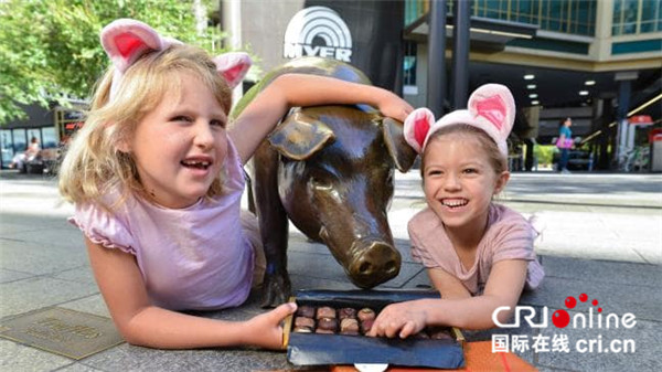 阿德萊德倫德爾購物中心門前,兩個(gè)小女孩正在品嘗黑格公司推出的豬年巧克力。
