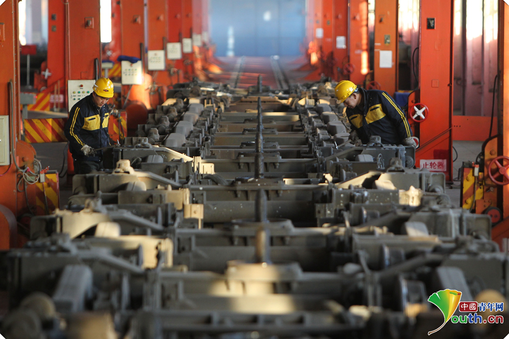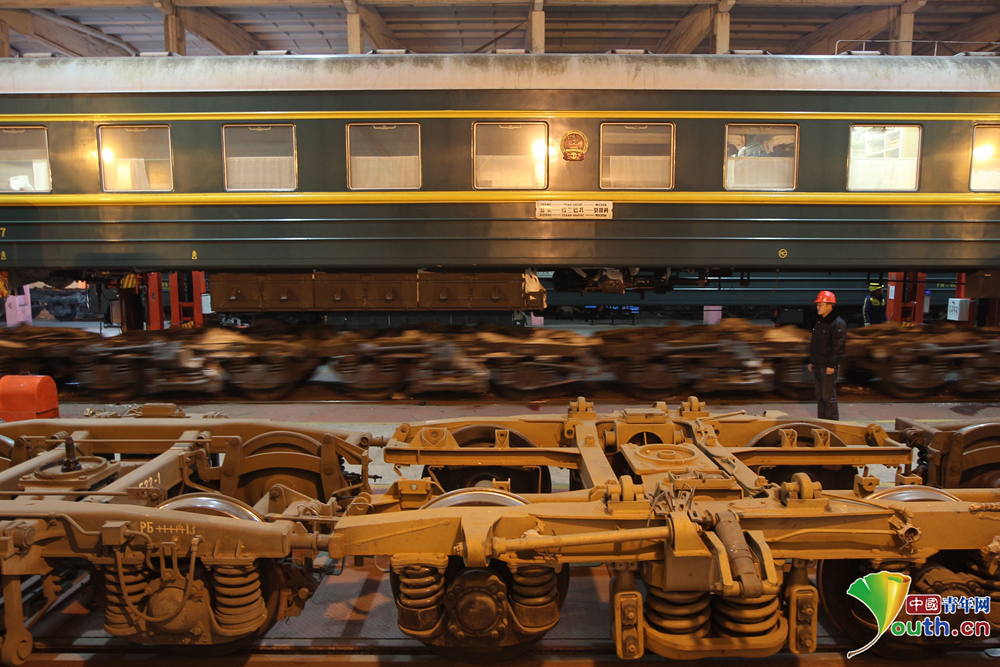 康亞斌和同事們所在的聯(lián)運(yùn)檢修車間擔(dān)負(fù)著北京至烏蘭巴托、北京至莫斯科以及呼和浩特至烏蘭巴托等6趟國(guó)際旅客列車換輪任務(wù),還要對(duì)這些車輛重要部件進(jìn)行定期檢修。