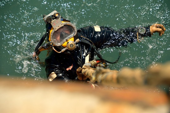 因?yàn)榻?jīng)常要在淤泥里探摸,潛水員在水底的移動(dòng)大多都是“爬”著完成。在韓國(guó)搜尋“世越號(hào)”沉船遇難者遺骨時(shí),潛水員就是爬著,把沉船方圓5海里的海底,每一寸都摸了一遍。