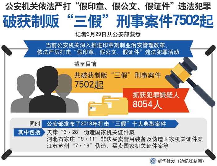 新華社北京3月29日電(記者丁小溪)記者29日從公安部獲悉,當前公安機關(guān)深入推進印章刻制業(yè)治安管理改革,依法嚴厲打擊“假印章、假公文、假證件”違法犯罪活動,截至目前,共破獲制販“三假”刑事案件7502起,抓獲犯罪嫌疑人8054人。