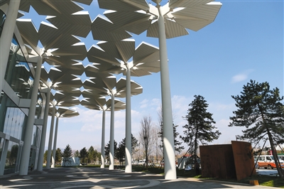 國(guó)際館由94把“花傘”構(gòu)成,建筑師在若干朵“花傘”下留出開(kāi)放的公共空間,像一個(gè)城市遮陽(yáng)傘,為人們提供一個(gè)遮陽(yáng)的休憩區(qū)。