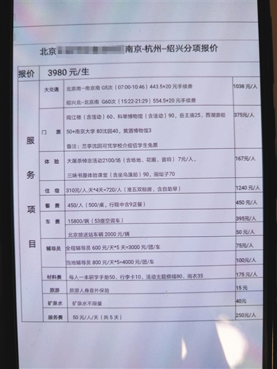 海淀區(qū)某中學(xué)則向家長公開了收費明細。在家長王先生提供的游學(xué)清單上,記者看到5天的研學(xué)旅行費用為3980元,游覽地點包括南京大屠殺遇難同胞紀(jì)念館、西湖和魯迅紀(jì)念館等。行程中還設(shè)置了眾多教育內(nèi)容,比如參加南京大學(xué)講座、著漢服行謝師禮、探究杭州西湖的光學(xué)現(xiàn)象等。