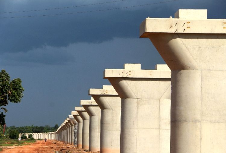 ↑2018年6月14日的老撾萬象楠科內(nèi)河特大橋橋墩。墩身澆筑完成標(biāo)志著中老鐵路全線最長(zhǎng)橋梁主體工程順利完工。 新華社發(fā)