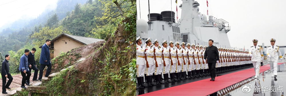 左圖為4月15日下午,在重慶石柱土家族自治縣中益鄉(xiāng)華溪村,習(xí)近平踏著濕滑的石階登上陡坡,前往貧困戶譚登周家看望(謝環(huán)馳攝);右圖為4月23日,習(xí)近平出席慶祝人民海軍成立70周年海上閱兵活動(dòng)(李剛攝)