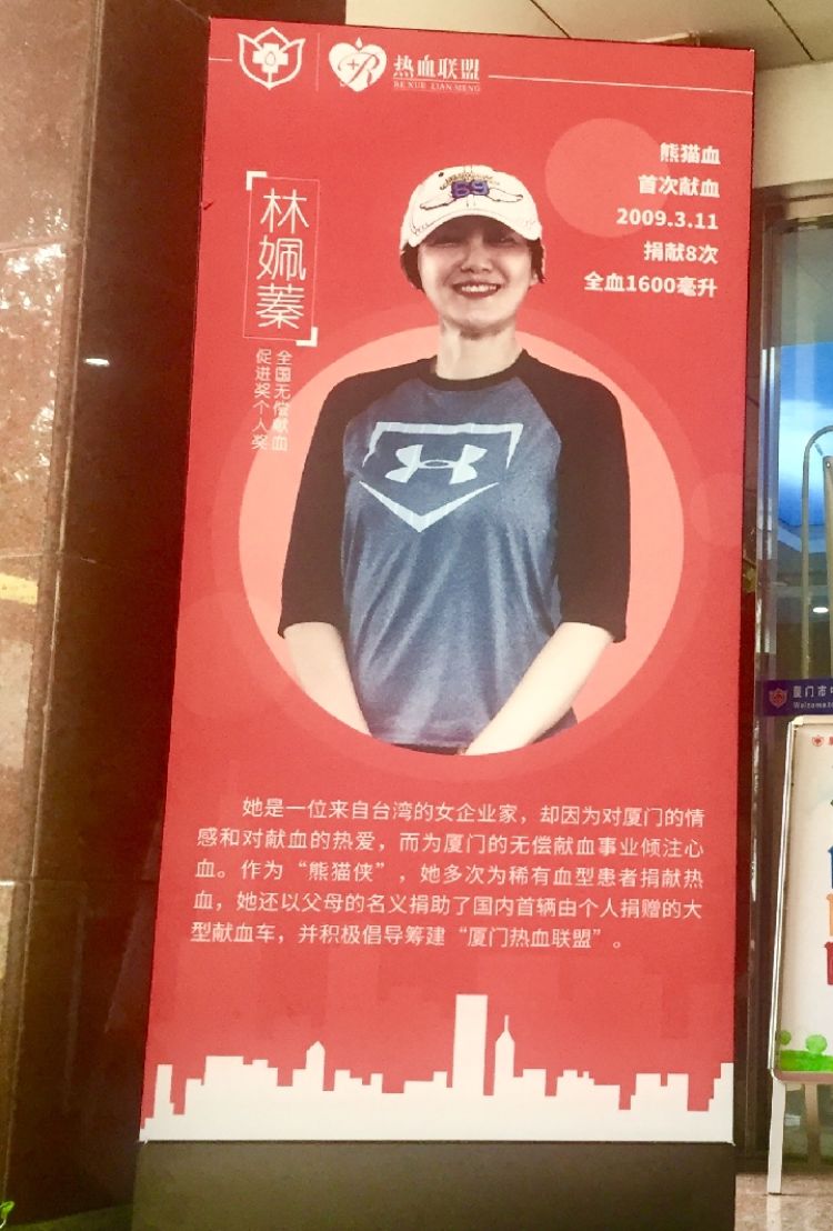 廈門市中心血站展板上宣介的是女臺商林姵蓁。她是Rh陰性血,這種血型因稀有而被稱為“熊貓血”。來自臺北的林姵蓁對無償獻(xiàn)血有一份執(zhí)著和擔(dān)當(dāng),這源于父親獻(xiàn)血幾十次的身教。她志愿成為無償為他人捐獻(xiàn)“熊貓血”的“熊貓俠”,在臺灣每次接到求助電話都會第一時(shí)間趕去獻(xiàn)血。