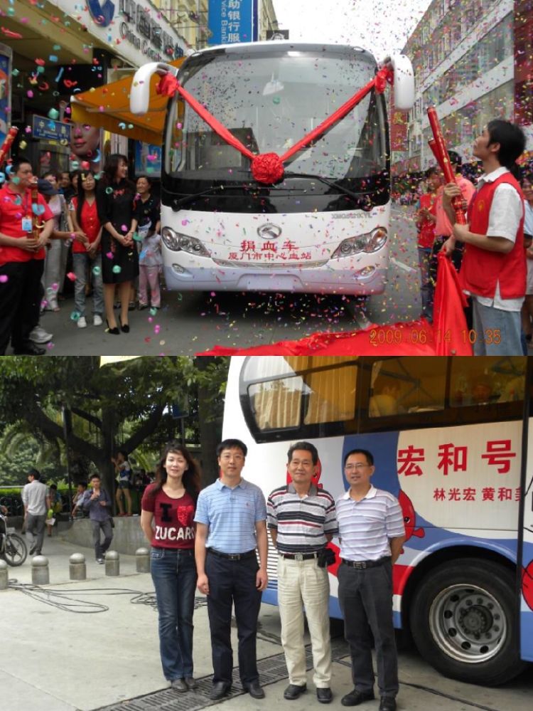上圖:廈門臺商林姵蓁捐贈了大型獻(xiàn)血車。下圖:林姵蓁(左一)和爸爸(左三)在“宏和號”獻(xiàn)血車旁合影留念。(受訪者供圖)