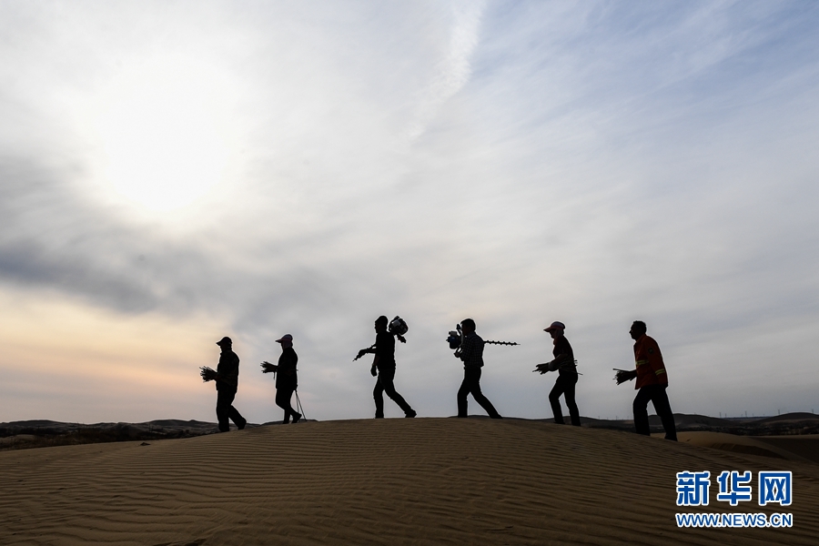 4月1日,在內蒙古鄂爾多斯市達拉特旗銀肯塔拉的沙漠中,治沙工人前往一處種植點。新華社記者 劉磊 攝