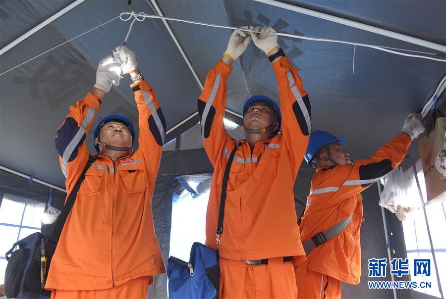 6月20日,國(guó)網(wǎng)成都供電公司連心橋共產(chǎn)黨員服務(wù)隊(duì)抗震救災(zāi)臨時(shí)黨支部成員在安置點(diǎn)帳篷內(nèi)架設(shè)電線、安裝電燈。新華社記者 劉坤 攝