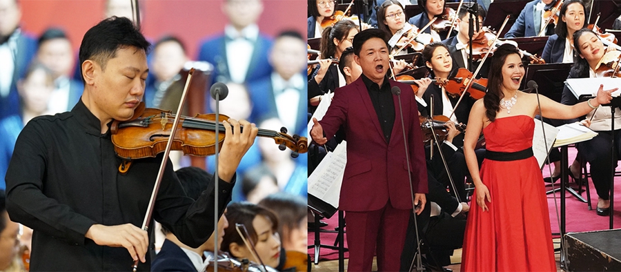 擔(dān)任《梁?!沸√崆侏?dú)奏的陳曦(上左),17歲就獲得第12屆柴可夫斯基國際音樂比賽小提琴銀獎(jiǎng),那屆金獎(jiǎng)可是空缺的哦。青年男高音歌唱家王傳越(右圖左)曾獲2015年第15屆柴可夫斯基大賽銀獎(jiǎng),女高音歌唱家宋元明(右圖右)曾獲第48屆法國圖盧茲國際聲樂大賽第一名。