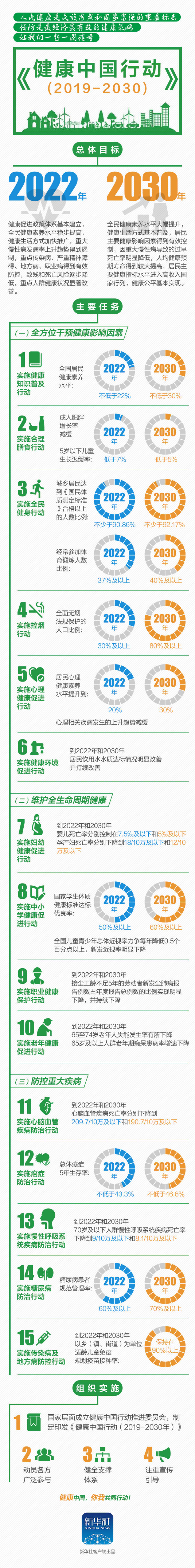 (一)加強(qiáng)組織領(lǐng)導(dǎo)。國家層面成立健康中國行動推進(jìn)委員會,制定印發(fā)《健康中國行動(2019-2030年)》,細(xì)化上述15個專項(xiàng)行動的目標(biāo)、指標(biāo)、任務(wù)和職責(zé)分工,統(tǒng)籌指導(dǎo)各地區(qū)各相關(guān)部門加強(qiáng)協(xié)作,研究疾病的綜合防治策略,做好監(jiān)測考核。要根據(jù)醫(yī)學(xué)進(jìn)步和相關(guān)技術(shù)發(fā)展等情況,適時組織修訂完善《健康中國行動(2019-2030年)》內(nèi)容。各地區(qū)要結(jié)合實(shí)際健全領(lǐng)導(dǎo)推進(jìn)工作機(jī)制,研究制定實(shí)施方案,逐項(xiàng)抓好任務(wù)落實(shí)。各相關(guān)部門要按照職責(zé)分工,將預(yù)防為主、防病在先融入各項(xiàng)政策舉措中,研究具體政策措施,推動落實(shí)重點(diǎn)任務(wù)。