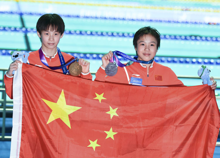 7月17日,中國(guó)選手陳芋汐(左)和盧為在頒獎(jiǎng)儀式后合影。新華社記者 夏一方 攝