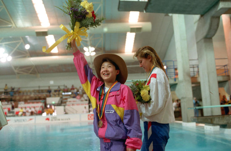 伏明霞在1991年第六屆世界游泳錦標(biāo)賽女子跳臺(tái)跳水比賽中獲冠軍。新華社記者 程至善 攝