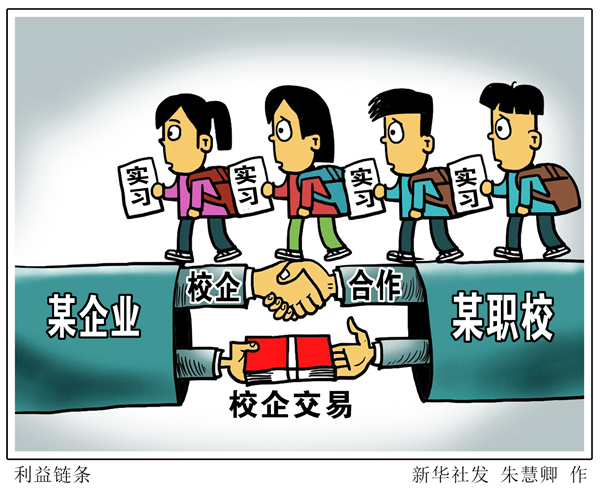 業(yè)內(nèi)人士認(rèn)為,一些職業(yè)學(xué)校將學(xué)生隨意送到一些與專業(yè)無關(guān)的企業(yè)實(shí)習(xí),甚至以此牟利,這背離了職業(yè)教育的初衷。教育、人社等主管部門應(yīng)加大對職校實(shí)習(xí)的監(jiān)管力度,斬?cái)嗦毿?shí)習(xí)背后的利益鏈條,防止“校企合作”成為“校企交易”。