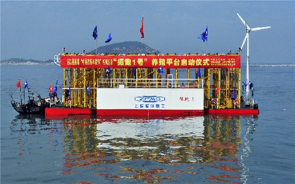 ??? 2018年10月26日上午,全國首創(chuàng)的深遠(yuǎn)海機(jī)械化養(yǎng)殖平臺“振鮑1號”在連江縣苔菉鎮(zhèn)東洛島海域下水啟用。新華網(wǎng)發(fā)(鄭帥 攝)