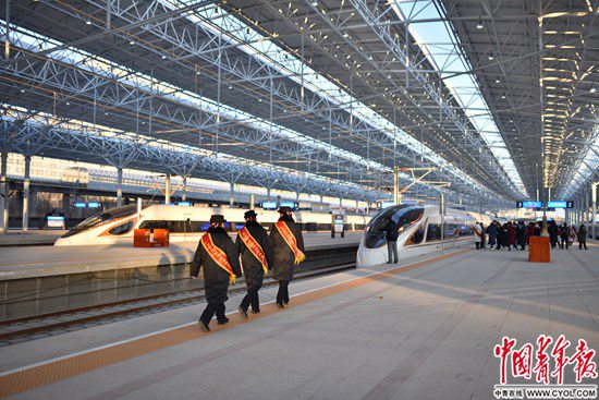 12月30日,北京至張家口高速鐵路開通運營,京張高鐵設(shè)計時速350公里,全線設(shè)北京北、清河、沙河(不辦理客運)、昌平、八達嶺長城、東花園北、懷來、下花園北、宣化北、張家口10座車站。京張高鐵是我國首條智能化高速鐵路,也是2022年冬奧會的“門戶工程”。北京北站站臺,三名站務人員走向一輛即將發(fā)車的京張高鐵列車。 實習生 宋欣然/攝