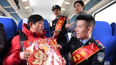 春節(jié)臨近,列車車窗上貼著窗花,車廂內張燈結彩。為了讓老鄉(xiāng)們快樂回家,貴州團省委組織的青年文藝志愿者與廣鐵集團廣州客運段動車2隊的乘務員們一起在車廂表演起豐富多彩的文藝節(jié)目。