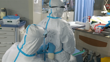 穿上隔離服的醫(yī)護(hù)人員只能露出一雙眼睛,誰也認(rèn)不出對方,于是他們進(jìn)入隔離區(qū)的第一件事,就是相互在隔離服上寫下對方的名字或者外號,有時(shí)還會藝術(shù)創(chuàng)作一下,這成了隔離病房里“神秘的儀式”。