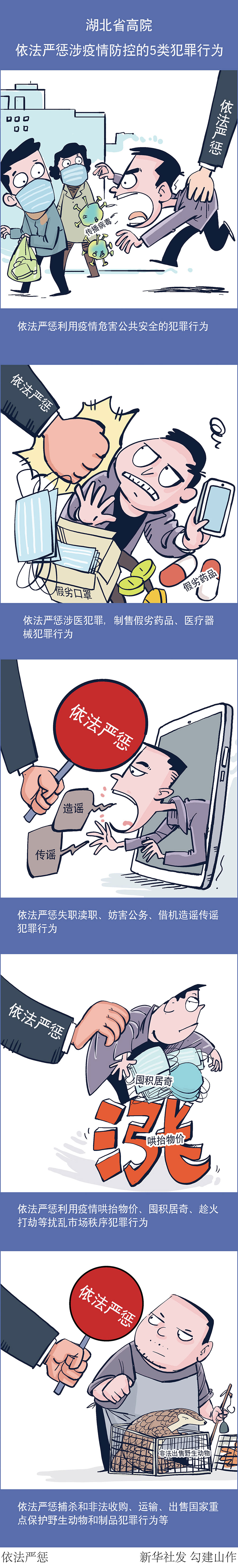 這一意見指出,各級法院要充分發(fā)揮刑事審判職能作用,依法嚴(yán)懲涉新型冠狀病毒感染的肺炎疫情防控的犯罪行為,切實(shí)保障疫情防控工作順利進(jìn)行,堅(jiān)決維護(hù)社會(huì)大局穩(wěn)定。其中,重點(diǎn)提及了5類:依法嚴(yán)懲利用疫情危害公共安全的犯罪行為;依法嚴(yán)懲涉醫(yī)犯罪,制售假劣藥品、醫(yī)療器械犯罪行為;依法嚴(yán)懲失職瀆職、妨害公務(wù)、借機(jī)造謠傳謠犯罪行為;依法嚴(yán)懲利用疫情哄抬物價(jià)、囤積居奇、趁火打劫等擾亂市場秩序犯罪行為;依法嚴(yán)懲捕殺和非法收購、運(yùn)輸、出售國家重點(diǎn)保護(hù)野生動(dòng)物和制品犯罪行為等。