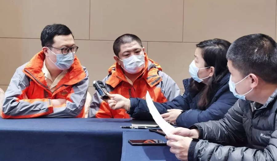 關(guān)宏奎(左二)和同事一起接受本臺記者勁清的采訪
