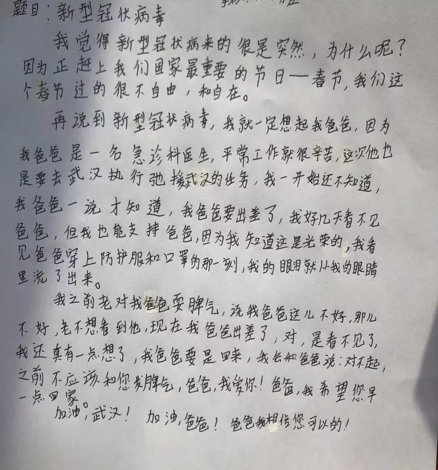 信里他先反思了一下自己,說以前盼望著爸爸上班,不希望爸爸在家管他?,F(xiàn)在爸爸去前線,我想到危險(xiǎn)性,現(xiàn)在又特別希望爸爸安安全全地回家,然后還說了一句,爸爸我愛你!以前從來沒有過。我跟他說,我希望你在生活和學(xué)習(xí)中面對困難,無所畏懼,一直向前,我還說爸爸不一定是你的驕傲,但一定要做你的榜樣。